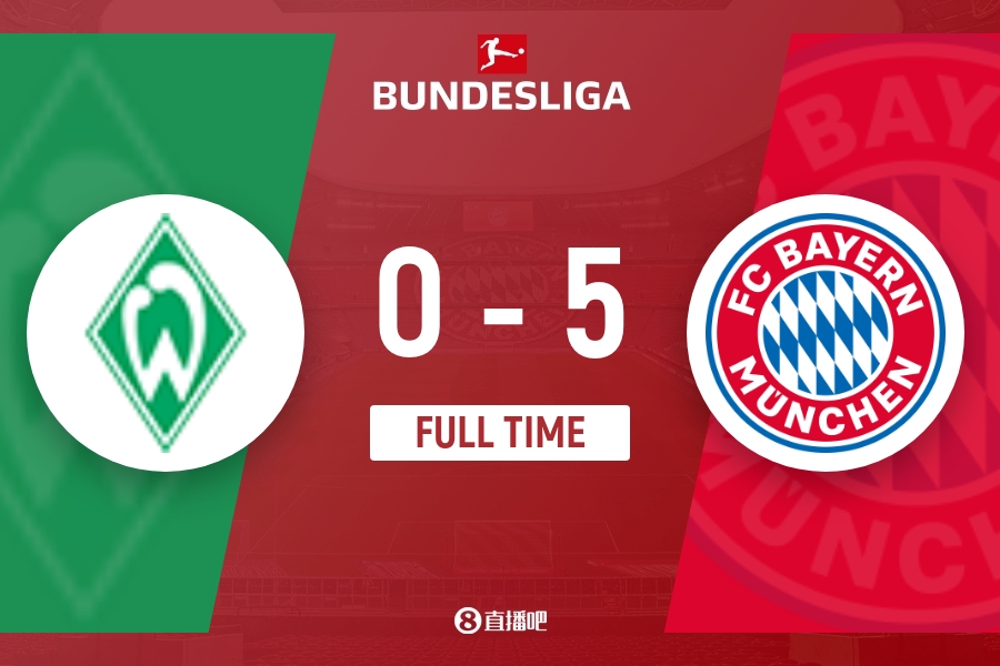 全场比赛结束,拜仁慕尼黑5-0不莱梅。