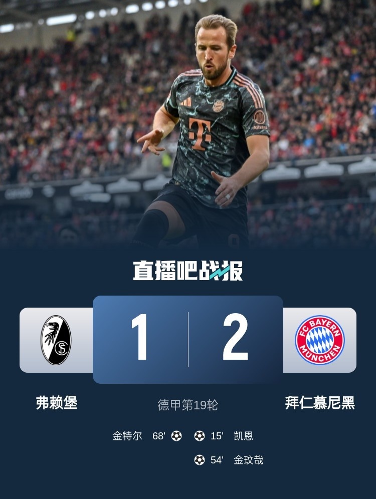 1月26日讯 北京时间22:30,德甲第19轮拜仁客场挑战弗赖堡,比赛在欧罗巴公园球场打响。上半场,穆西亚拉中柱;凯恩接戴尔横传,丝滑转身劲射破门!格雷茨卡伤退。下半场,金玟哉头球破门;格纳布里失良机;金特尔扳回一城。最终,拜仁2-1击败弗赖堡,取得德甲5连胜!继续领跑积分榜。