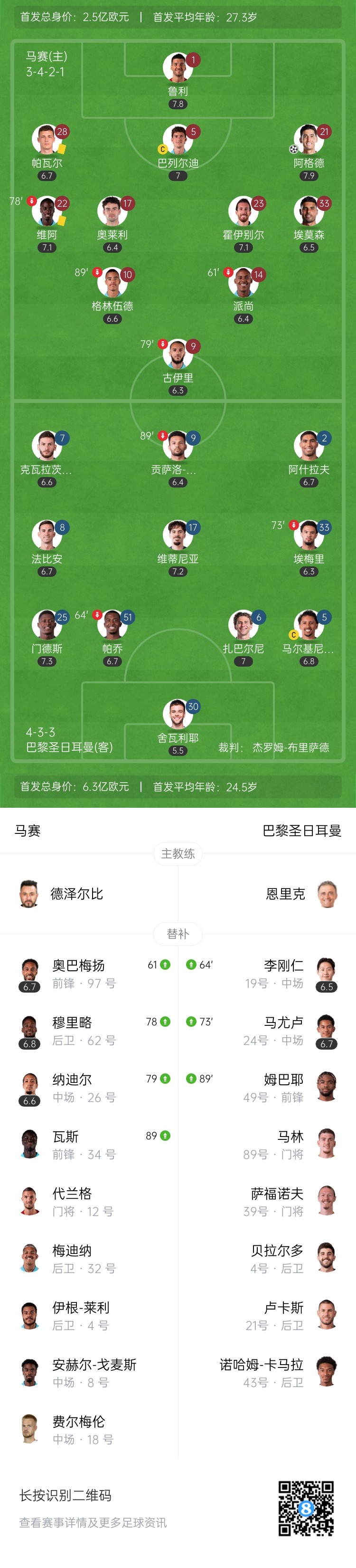 第90分钟,马赛主帅德泽尔比不满判罚被主裁两黄罚下↓