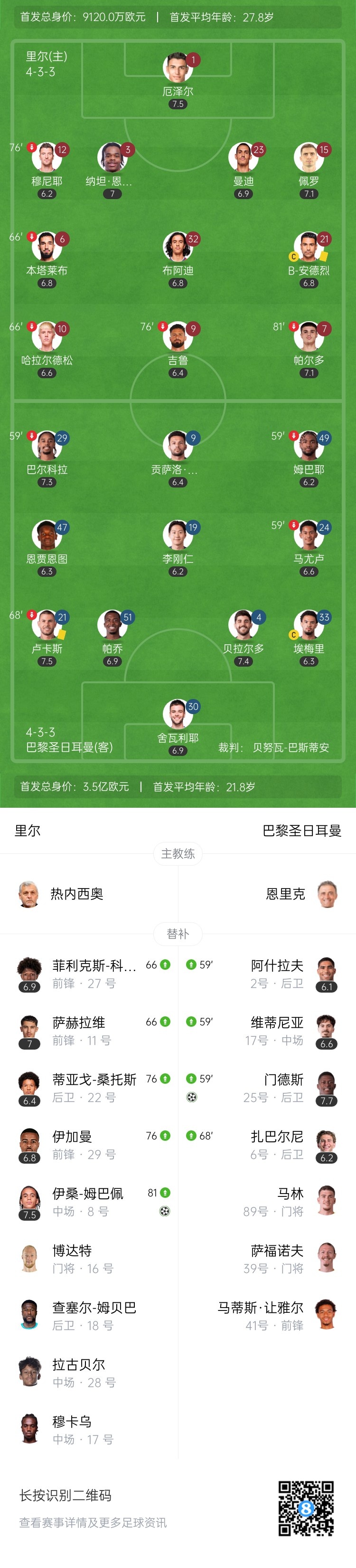 10月6日讯 北京时间2:45,法甲第7轮里尔vs巴黎圣日耳曼。上半场,双方均未获得射门好机会。下半场,努诺-门德斯替补登场贡献任意球世界波!姆巴佩现身看台观战,弟弟伊桑-姆巴佩替补4分钟绝平巴黎!最终,巴黎1-1战平里尔。