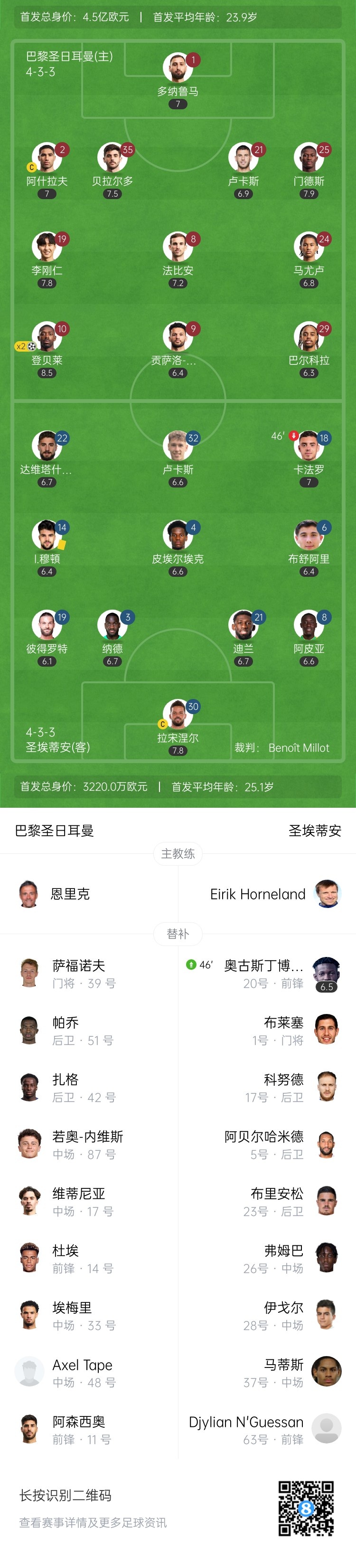 第64分钟,圣埃蒂安的任意球机会!达维塔什维利直接攻门绕过人墙!多纳鲁马扑救不及!圣埃蒂安扳回一球1-2巴黎↓