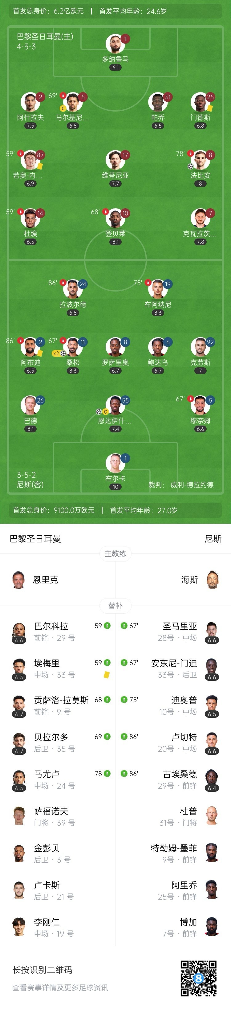 全场比赛结束,巴黎1-3尼斯。