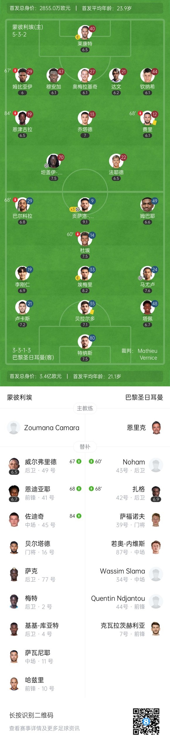 下半场没有补时,蒙彼利埃1-4巴黎。