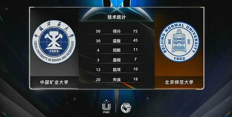 第四节,北京师大进攻回暖,内外开花打出11-2的攻击波再度将分差拉开到20分以上,中国矿大连续打铁失误,北京师大持续发力将优势扩大到30分以上,最终,北京师大75-50大胜中国矿大。