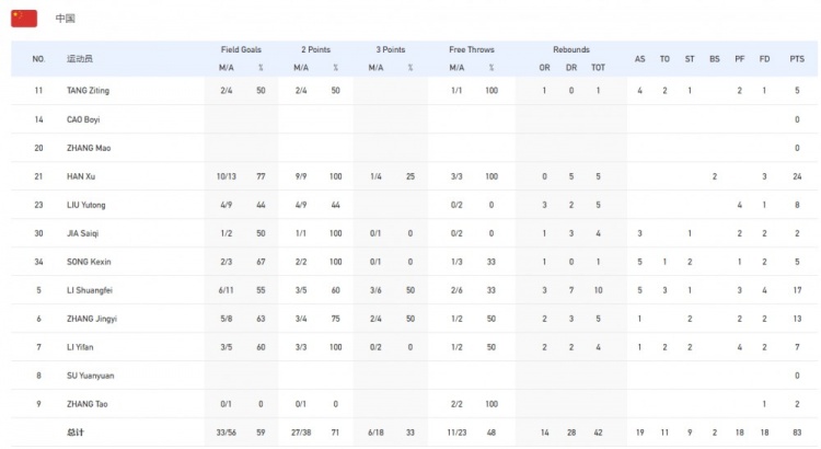 中国大学生女篮数据:韩旭13投10中24分5篮板2帽,李双菲17分10篮板5助攻1断,刘禹彤8分5篮板,贾赛琪2分4篮板3助攻,宋珂昕5分5助攻2断,张敬一13分5篮板,李一凡7分4篮板2断