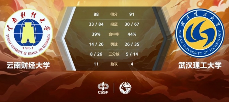 末节陈吉鹏和陈康瑞接连拿分抢开局,云南财大送上一波9-2的攻势追至3分重新看到希望;不过武汉理工及时回暖,黄智的2+1和付典钦的三分再度拉开比分。随后武汉理工顶住压力一直维持着5分左右的领先,王鹏翼和黄智最后时刻打进两记关键球拉开7分领先奠定胜局,陈康瑞最后的三分进球为时已晚。最终,武汉理工大学91-88力克云南财经大学顺利晋级8强。