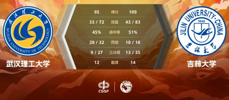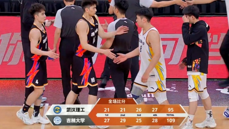 休息归来双方继续拉锯战,两队手感都很顺但手握领先的吉林大学一直稳定拿分守住优势,节中付典钦突然爆发连续命中三记三分,加上王鹏翼的2+1,武汉理工追至8分一度看到希望,但回头方伯杨回敬关键2+1,王鹏联手刘滨畅命中两记三分,吉林大学送出9-0的攻势重新拉开至17分锁定胜局。最终,吉林大学105-95击败武汉理工大学拿下比赛。