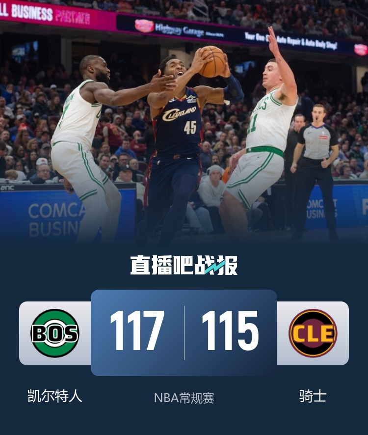 开场后凯尔特人手感火热在外线连中三分以14-2开局,亨特和米切尔先后命中三分止血,随后骑士找到节奏咬住比分。第二节上来骑士率先打出攻势完成反超,随后两队连续在外线对飚三分,场上比分也是十分胶着,半场结束前凯尔特人轰出一波9-0的攻势领先结束上半场。易边再战,两队刚开始还打得有来有回,随后凯尔特人又掀起一波14-0的攻势将场上分差拉大到21分,随后莫布里帮助骑士打回节奏重新咬住比分。最后一节骑士继续追分一度追到只差4分,杰伦·布朗和普理查德联手为凯尔特人及时稳住阵脚,虽然最后骑士连续三分强行续命,不过本场发挥出色的莫布里0.6秒绝平中投三不沾。最终,凯尔特人117-115送骑士3连败。