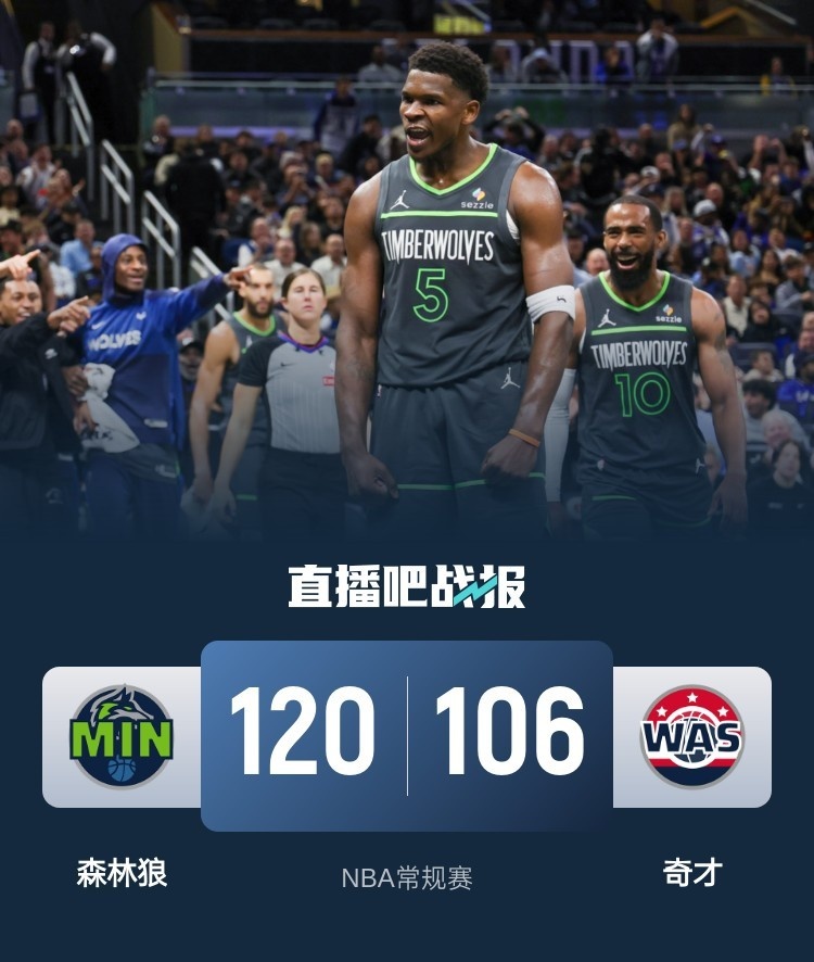 一开场,双方均表现慢热,连续打铁失误,得分非常困难,森林狼连投带罚取得微弱优势,次节两队进攻稍有回暖,奇才利用防守反击缩小分差,爱德华兹里突外投,普尔命中超远准压哨三分,半场战罢森林狼51-47领先奇才。下半场,奇才内外开花反超比分,康利连投带罚稳住局势,末节森林狼火力全开,爱德华兹连中三分带队取得两位数领先,奇才大势已去无力回天。最终,森林狼120-106击败奇才,客场过关。