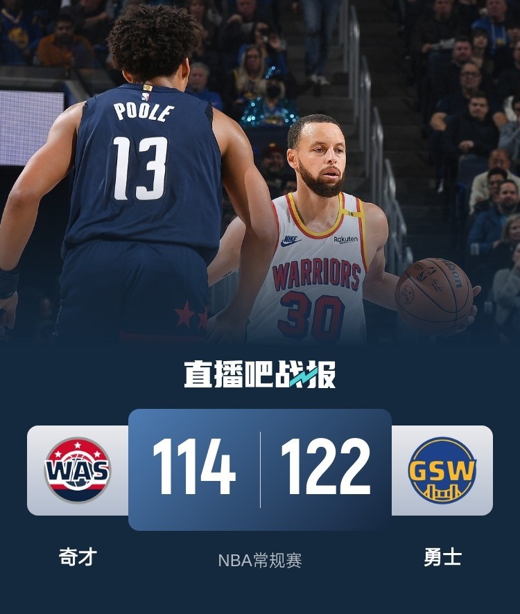 比赛开始,格林开场打了3分钟就伤退,库里遭遇严防死守,维金斯不断冲击内线打开局面,奇才内外开花强势回应,次节双方继续缠斗,普尔高效发挥,奇才外线连中三分保持优势,半场战罢勇士53-60落后奇才。易边再战,普尔延续火力,勇士连投带罚反超比分,末节勇士稳扎稳打保持5分左右领先,关键时刻库里和维金斯先后飙中三分,奇才苦苦追赶无果,库里因伤提前返回更衣室。最终,勇士击败奇才,送给对手9连败。