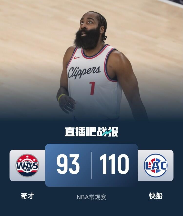 比赛开始,快船率先发力,多点开花打出19-7的开局,奇才冲击内线拿分努力追赶,次节快船牢牢占据场上主动,班巴连中三分帮助球队将分差拉开到20分以上,奇才零敲碎打拿分苦苦支撑,半场战罢快船63-41领先奇才。易边再战,快船命中率下降,奇才趁势打出15-5的攻击波缩小分差,哈登连造杀伤稳住局势,末节奇才奋力反击缩小分差,快船换回主力后哈登连续助攻鲍威尔三分命中锁定胜局。最终,快船击败奇才,送给对手12连败。