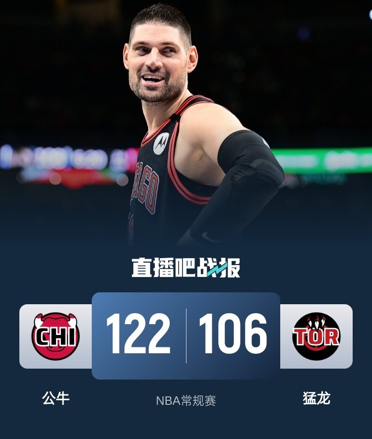 比赛开始,奎克利联手巴恩斯带队发力建立主动权,但武切维奇开始发力,里突外投单节得分上双给出回应,首节公牛领先3分,次节双方继续拉锯战,公牛全民皆兵半场出场球员皆有得分,而奎克利接连外线发炮回应,半场公牛领先5分。下半场,巴雷特联手巴恩斯带队追分,但公牛替补布泽利斯和史密斯外线能给出回应,公牛末段发力拉开双位数领先,末节公牛继续发力,道苏姆有攻有传带队一波7-0一度拉开近20分领先,猛龙追分但公牛总能回应保持住十几分领先,最终公牛122-106力克猛龙,终结对手5连胜。
