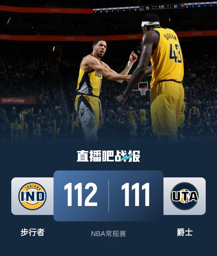 比赛上来,两队打得比较胶着,不过在11-11平后爵士突然发力打出一波12-0的攻势拉开分差,之后的比赛步行者一直处于追分,不过爵士一直没有给他们反超的机会,半场结束时分差还剩4分;下半场回来,步行者又是利用一波小高潮迅速实现反超,不过这个势头并没有延续太长时间,爵士及时给出回应重夺领先,末节步行者的进攻再次出现问题,半节时间仅拿到6分,爵士趁势将分差再度拉开,好在是步行者并没有放弃连续追分打回悬念,关键时刻西亚卡姆命中反超三分,马尔卡宁两罚不中,乔治虽然命中续命三分但无济于事,最终步行者逆转爵士迎来四连胜。