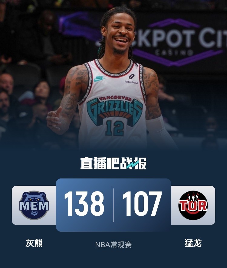 首节对决猛龙展现近期良好状态,他们在和灰熊拉锯半节时间后依靠一波12-2的攻势抢占先机;灰熊这边遭遇5分钟仅得2分的得分荒,猛龙在次节开局连续飙进三分的情况下一度拉开10分优势;不过好在近期状态大热的小杰克逊站出来连连拿分迅速稳住局面,这一节双方均砍下30+的单节得分,猛龙顶住压力带着6分领先进入下半场。休息归来场面两极分化,上半场表现出色的猛龙这一节哑火,灰熊则打出联盟最强进攻球队的风采,他们先是一波12-0的攻势送上开胃小菜,随后又送上19-5的攻势一举拉开比分,第三节爆砍43分将优势扩大至20分以上,末节灰熊继续占优早早锁定胜局。最终,灰熊客场轻取猛龙,最近11场比赛拿下10场坐稳西部第二。