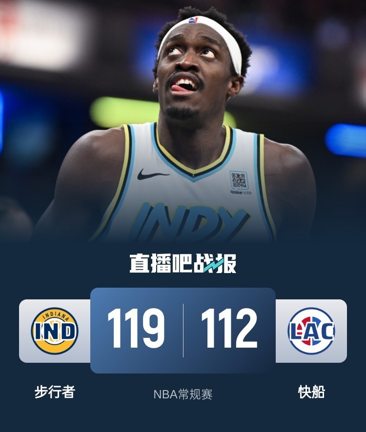 首节之争快船早早进入状态手感热得发烫,球队首节虽然没有绝对高分但多点开花,他们以超六成的命中率爆砍42分并在第一节就确立起20分的巨大领先,步行者祸不单行,特纳遭遇对手马瑟林的一巴掌直接导致脑震荡退出比赛;然而次节快船状态急转直下,这一节他们仅得19分,反倒是一直被动的步行者在这一节迎来爆发,开局轮换他们上来就是一波17-4的攻势,最后时刻再送19-0的攻势,他们短短一节时间直接抹掉第一节落后的20分分差并反超4分进入下半场。休息归来快船前半节仍然被动迟迟无法缩小分差,不过步行者遭遇黑色三分钟给了对手机会,快船抓住机会送上10-0的攻势扭转局势。末节之争双方拉锯悬念留到最后,决胜时刻西亚卡姆和哈利伯顿站出来一人一记三分打出14-0的攻势化被动为主动,期间快船受限又是被帽又是失误,读秒阶段还丢防守篮板彻底失去机会。最终,步行者客场力克快船拿下比赛。