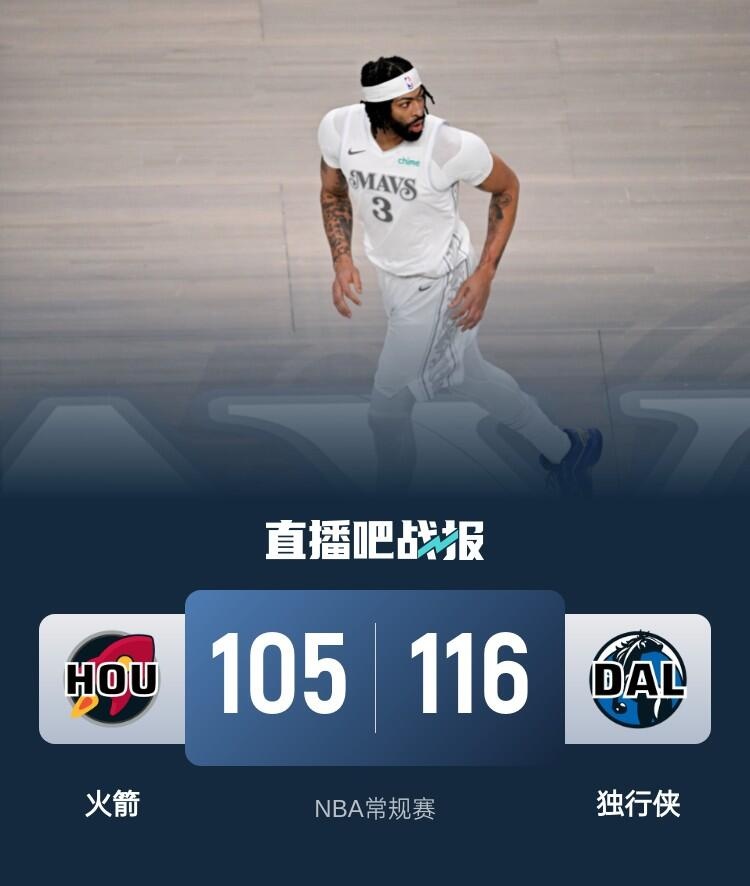 一开场,浓眉制霸攻防,内外开花独得14分帮助球队取得两位数领先,杰伦-格林里突外投带队追赶,次节浓眉和丁威迪联手带出10-1的攻势一举将分差拉开到20分,杰伦-格林连续拿分苦苦支撑,半场战罢独行侠65-48领先火箭。下半场,火箭奋力反击轰出19-4的攻击波,独行侠连投带罚稳住局势,浓眉受伤返回更衣室,末节独行侠稳扎稳打保持优势,火箭苦苦追赶无果。最终,独行侠116-105击败火箭,送给对手6连败。