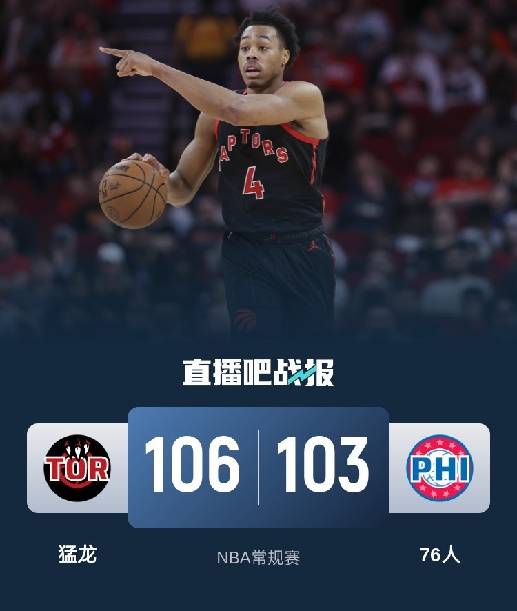 比赛上来,猛龙就展示出了巨大的优势,一波17-4的开局迅速将分差拉开到两位数,整个第一节76人的进攻都不太好,单节得分未能上20分,次节猛龙的命中率急剧下滑,半节时间仅拿到6分,而76人则是找回感觉攻势如潮,半场结束时已经反超2分;下半场回来,两队开始陷入到长时间的拉锯战,比赛悬念也是保持到了最后,关键时刻猛龙进攻混乱,莫格博接锅三分出界给76人留下机会,但恩比德空位机会不丢反而失误,迪克两罚一中再次送机会,马克西远投继续打铁,最终猛龙险胜76人,结束四连败的同时也送给后者四连败。