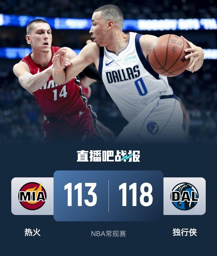 上半场,双方开场势均力敌,比分始终紧咬,次节两队大打对攻,但比分依旧咬得很紧,热火多点开花,独行侠连投带罚给出回应,半场战罢独行侠55-56落后热火1分。下半场,双方依旧打得难解难分,末节两队争夺陷入白热化,关键时刻艾克萨姆连续拿分带队确立优势,热火连中三分苦苦追赶,克里斯蒂关键中投命中。最终,独行侠118-113力克热火,主场过关。