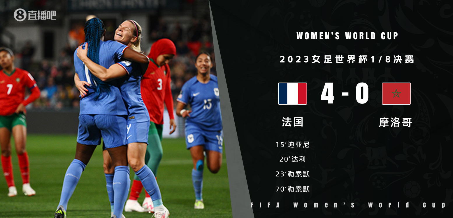 8月8日讯,北京时间8月8日19点,女足世界杯1/8决赛最后一场,法国女足对阵摩洛哥女足。上半场,迪亚妮头球破门为法国队首开纪录,随后迪亚妮先后助攻达利、勒索默连入两球扩大比分优势;下半场,勒索默头球破门完成梅开二度!全场比赛结束,法国女足4-0摩洛哥女足,1/4决赛法国女足将在8月12日15点对阵澳大利亚女足!