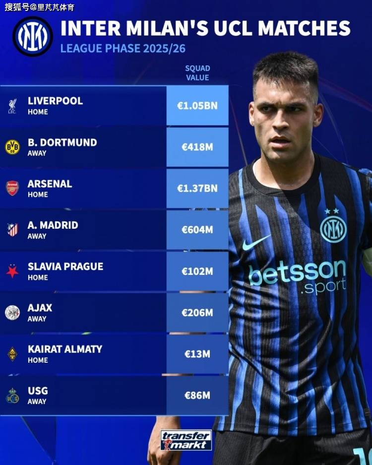 2025/26赛季欧冠联赛阶段抽签,国米联赛阶段8支对手出炉。分别包括有利物浦(主)、多特蒙德(客)、阿森纳(主)、马德里竞技(客)、布拉格斯拉维亚(主)、阿贾克斯(客)、阿拉木图凯拉特(主)、圣吉罗斯(客)等。