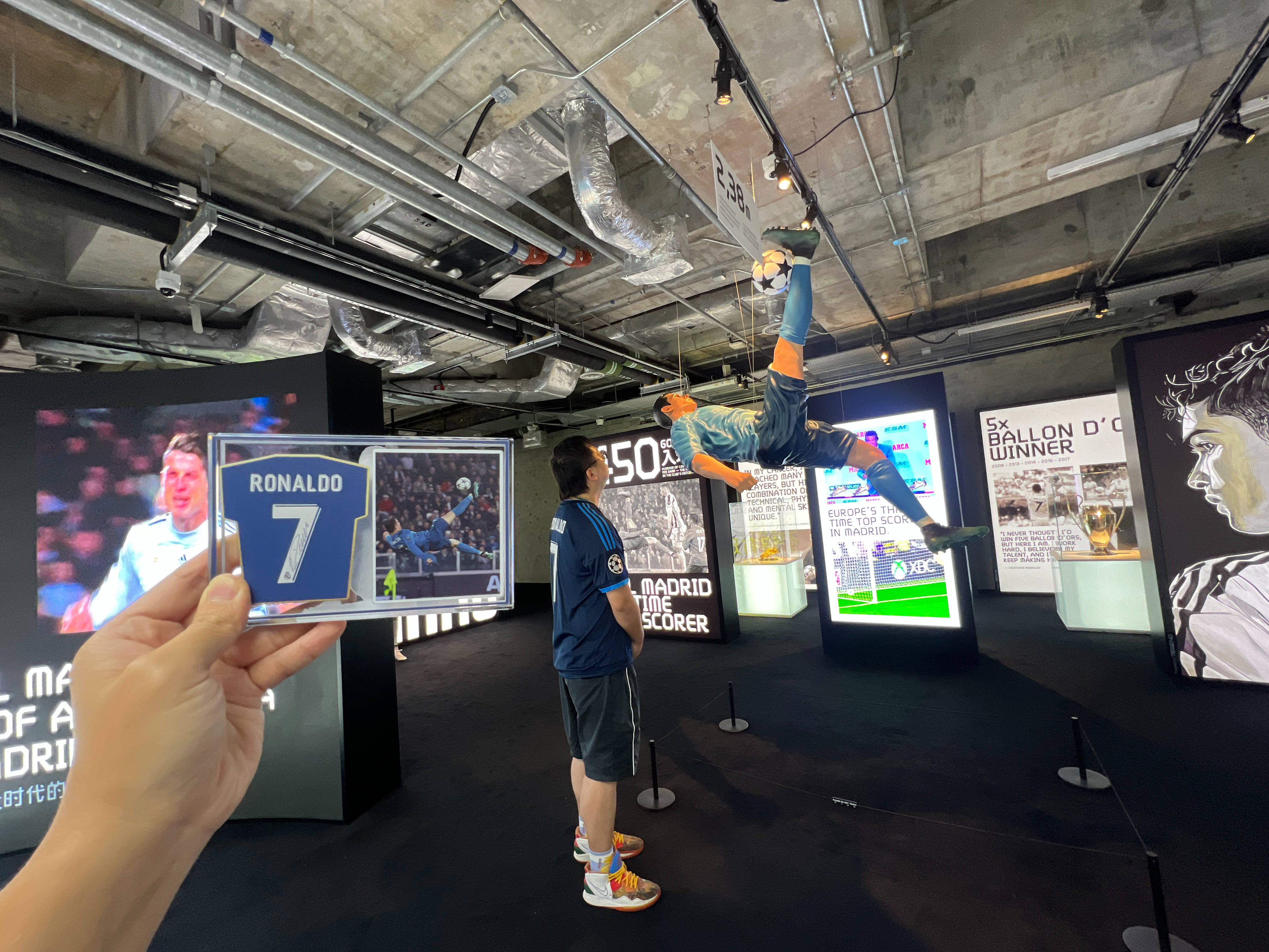 最令人震撼的,是对他招牌动作与辉煌时刻的还原。“SIU”庆祝动作的一条龙分解装置前围满了观众,从摆臂、起跳再到落地怒吼,每个细节都被精准复刻,让人忍不住跟着模仿;而不远处的2.38米倒钩模型,更让所有人驻足惊叹。当亲眼看到与当年进球高度、大小完全一致的模型时,才真正明白那记倒钩有多不可思议——相当于从地面起跳摸到近两层楼的高度,身体在空中的舒展与爆发力,透过模型的比例变成了可量化的震撼。旁边的解说牌上写着“这记倒钩需时速28公里的助跑、1.2秒的空中停留”,一组组数据让传奇有了更具体的重量。