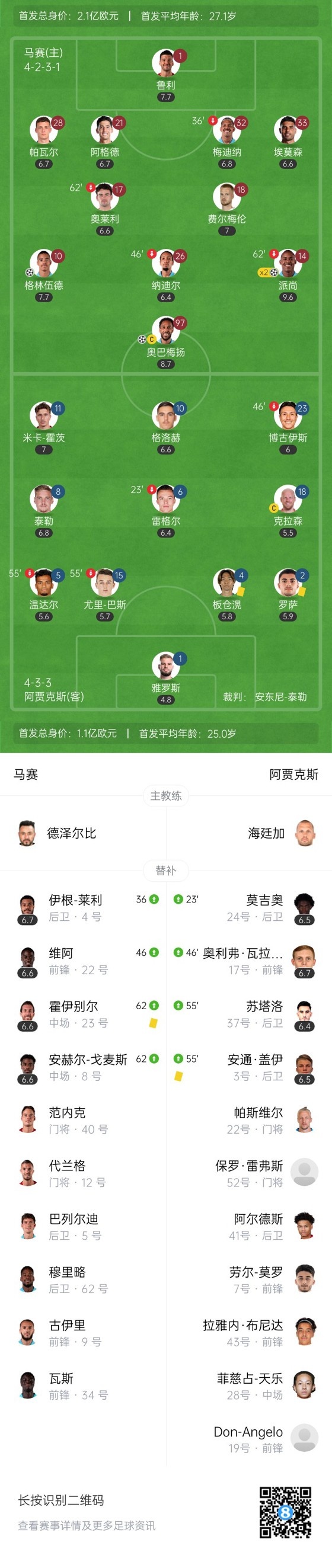 第25分钟,马赛再下一城!阿贾克斯后场失误,奥巴梅杨中路直塞禁区格林伍德推射破门,马赛3-0阿贾克斯。↓