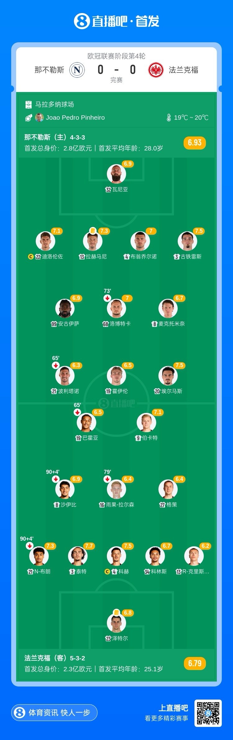 11月5日讯 北京时间11月5日凌晨1时45分,2025-26赛季欧冠联赛阶段第4轮在马拉多纳球场展开角逐,那不勒斯主场迎战法兰克福。上半场霍伊伦失良机,下半场麦克托米奈错失良机。最终那不勒斯主场0-0闷平法兰克福,那不勒斯欧冠前4轮仅取得1胜。
