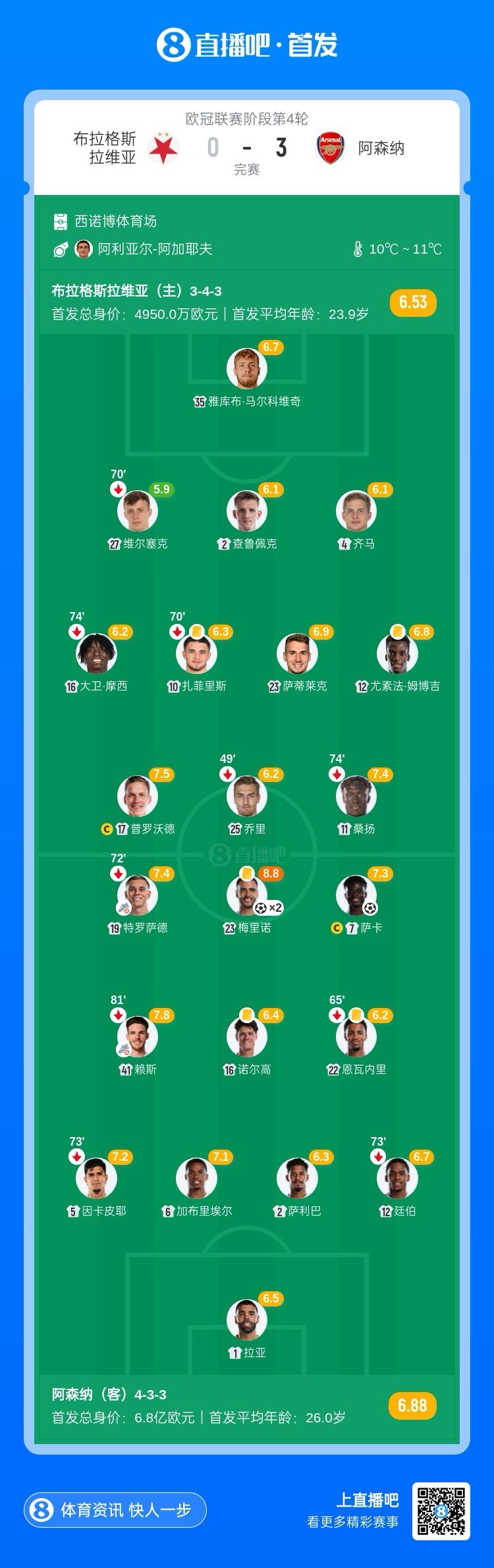 全场比赛结束,阿森纳3-0布拉格斯拉维亚。