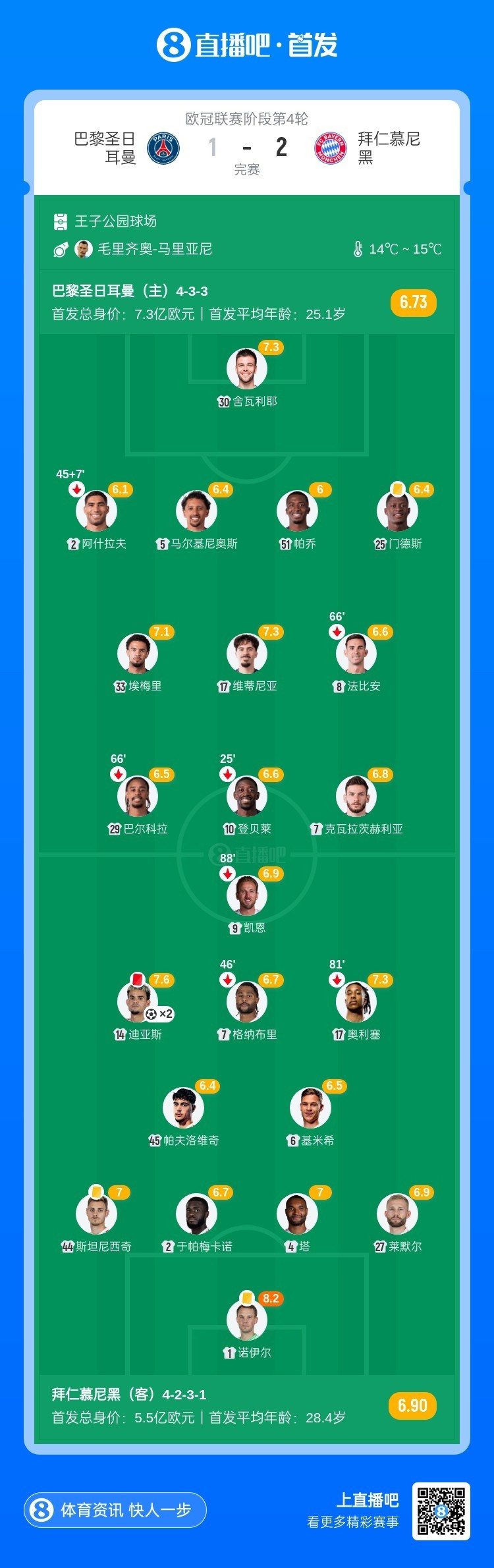 11月5日讯 北京时间11月5日凌晨4时整,2025-26赛季欧冠联赛阶段第4轮在王子公园体育场展开角逐,巴黎圣日耳曼主场迎战拜仁慕尼黑。上半场迪亚斯梅开二度+剪刀脚直红,马尔基尼奥斯思考人生送礼,登贝莱和阿什拉夫伤退,下半场内维斯扳回一城。最终十人拜仁客场2-1战胜巴黎圣日耳曼,拜仁开季各赛事豪取16连胜+欧冠全胜领跑,巴黎遭遇本赛季欧冠首败。