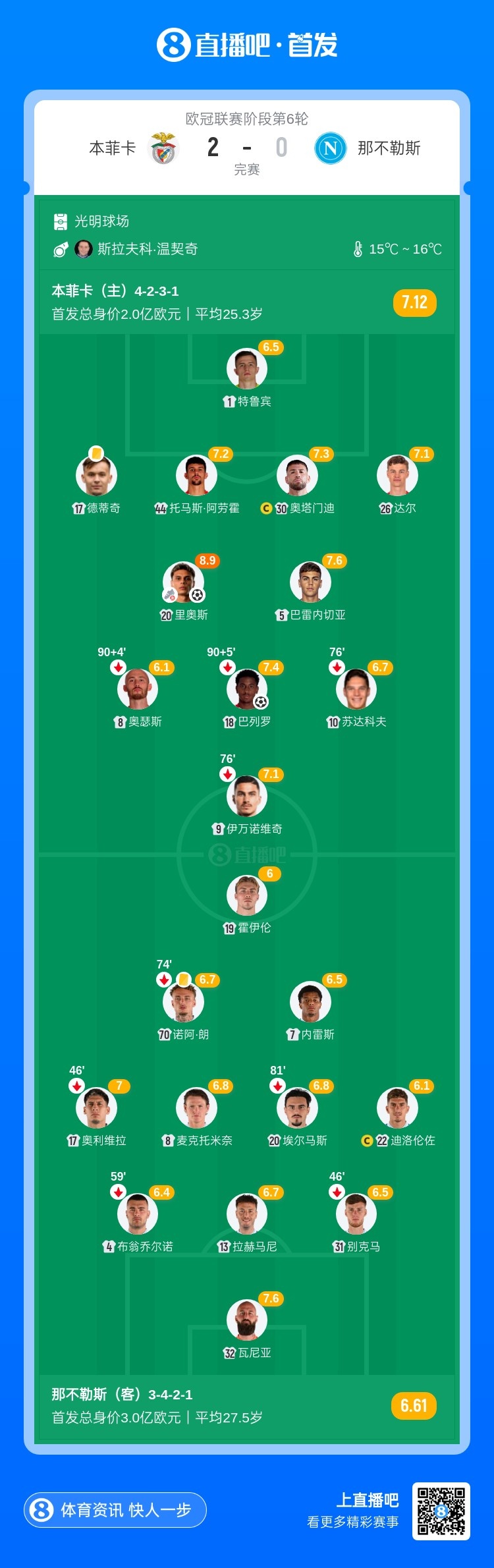 第20分钟,本菲卡禁区前挑传,伊万诺维奇头球摆渡,里奥斯前插垫射破门!本菲卡1-0领先那不勒斯↓