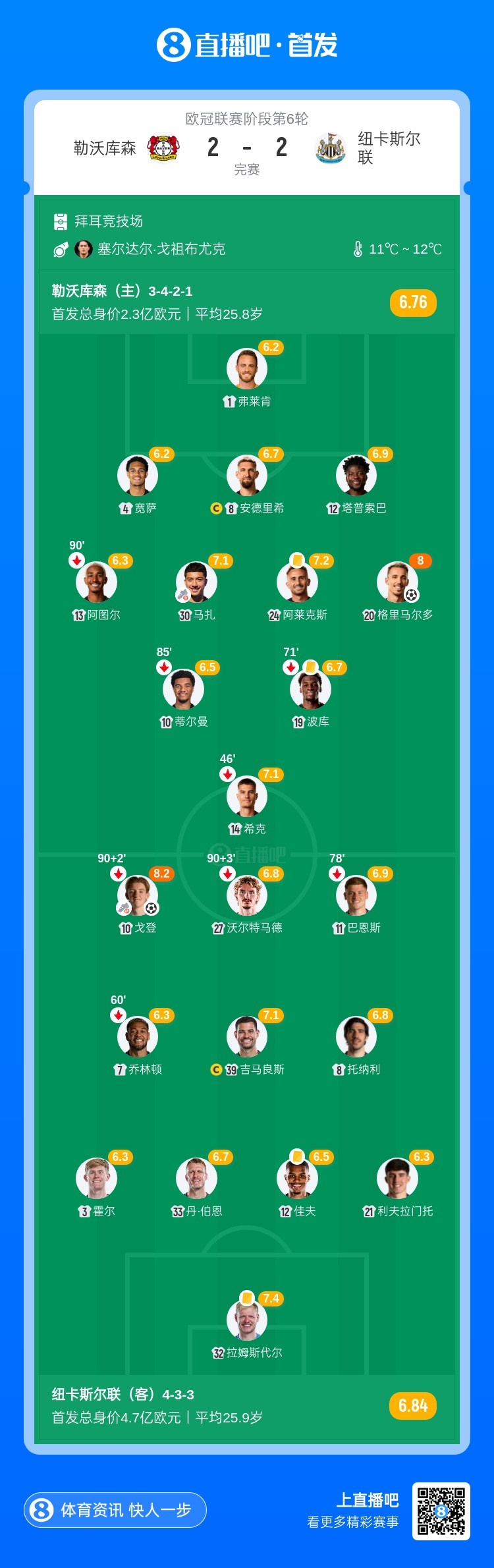 12月11日讯 北京时间4:00,欧冠联赛阶段第6轮勒沃库森vs纽卡斯尔联,比赛在拜耳竞技场打响!上半场,安德里希制造了吉马良斯的乌龙!下半场,沃尔特马德积极逼抢制造点球,戈登点射扳平!随后戈登又助攻刘易斯·麦利反超!格里马尔多88分钟绝平!最终,纽卡2-2战平勒沃库森。
