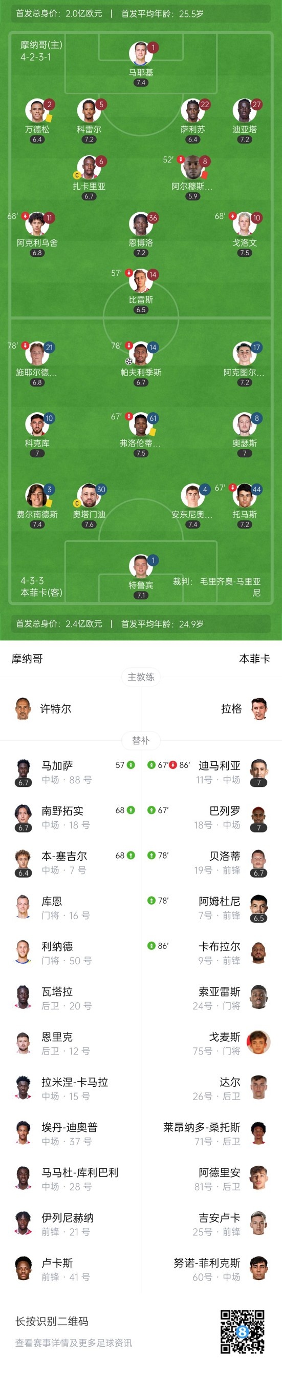 上半场补时3分钟,摩纳哥0-0本菲卡。