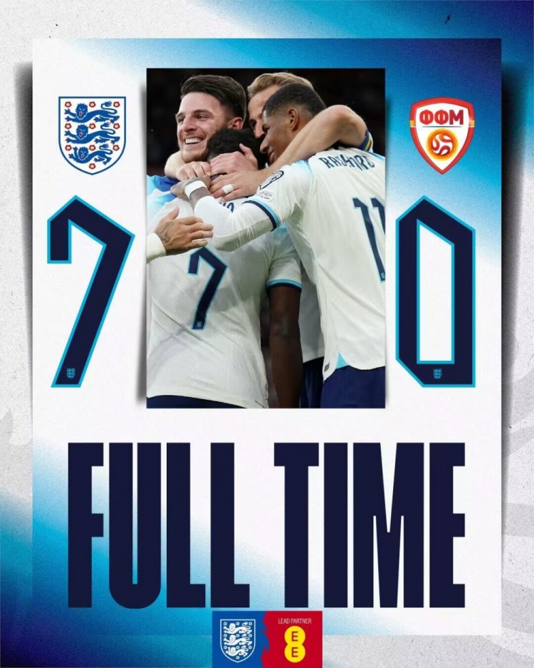 下半场没有伤停补时,最终英格兰7-0北马其顿。