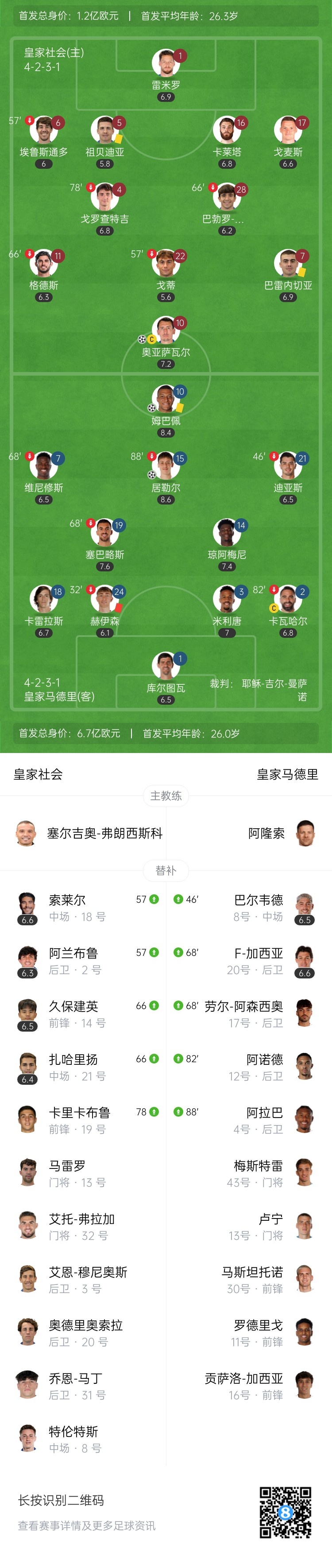 9月14日讯 北京时间9月13日22:15,2025-26赛季西甲联赛第4轮,皇家社会坐镇阿诺埃塔体育场迎战皇马。上半场姆巴佩单刀球破门,随后又射中立柱,雷米罗多次救险,赫伊森直红,居勒尔上半场尾声阶段接姆巴佩助攻为皇马再下一城,皇马暂2-0皇家社会;下半场卡瓦哈尔手球送点,奥亚萨瓦尔点射,最终十人皇马2-1战胜皇家社会,开赛四连胜领跑积分榜。