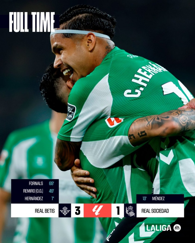 全场比赛结束,最终贝蒂斯3-1战胜皇家社会。