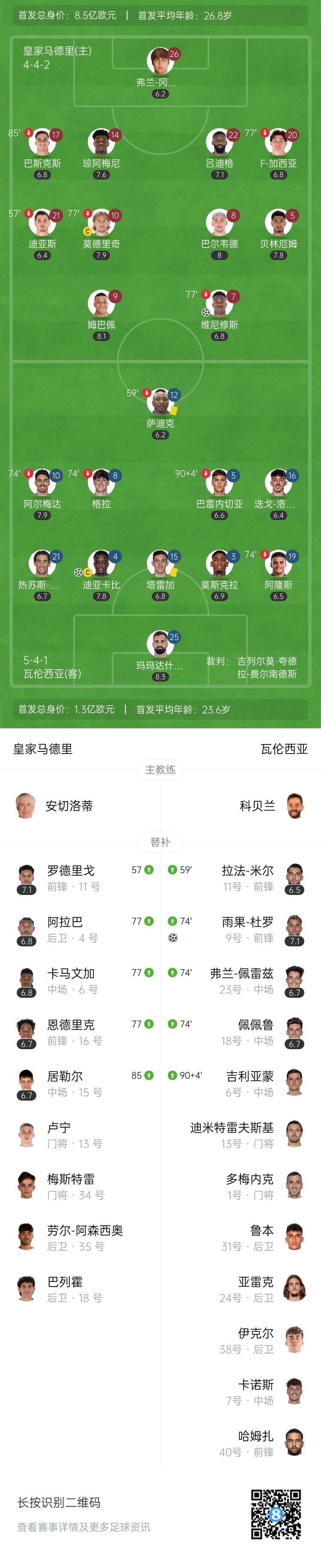 这球安切洛蒂还因为不满判罚吃到黄牌。↓