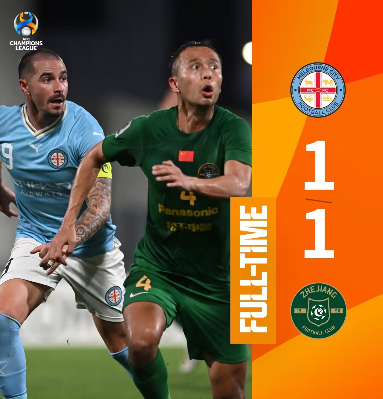 第90+9分钟,李提香开出左侧角球,穆谢奎高高跃起头球绝平,浙江读秒阶段1-1绝平墨尔本城↓