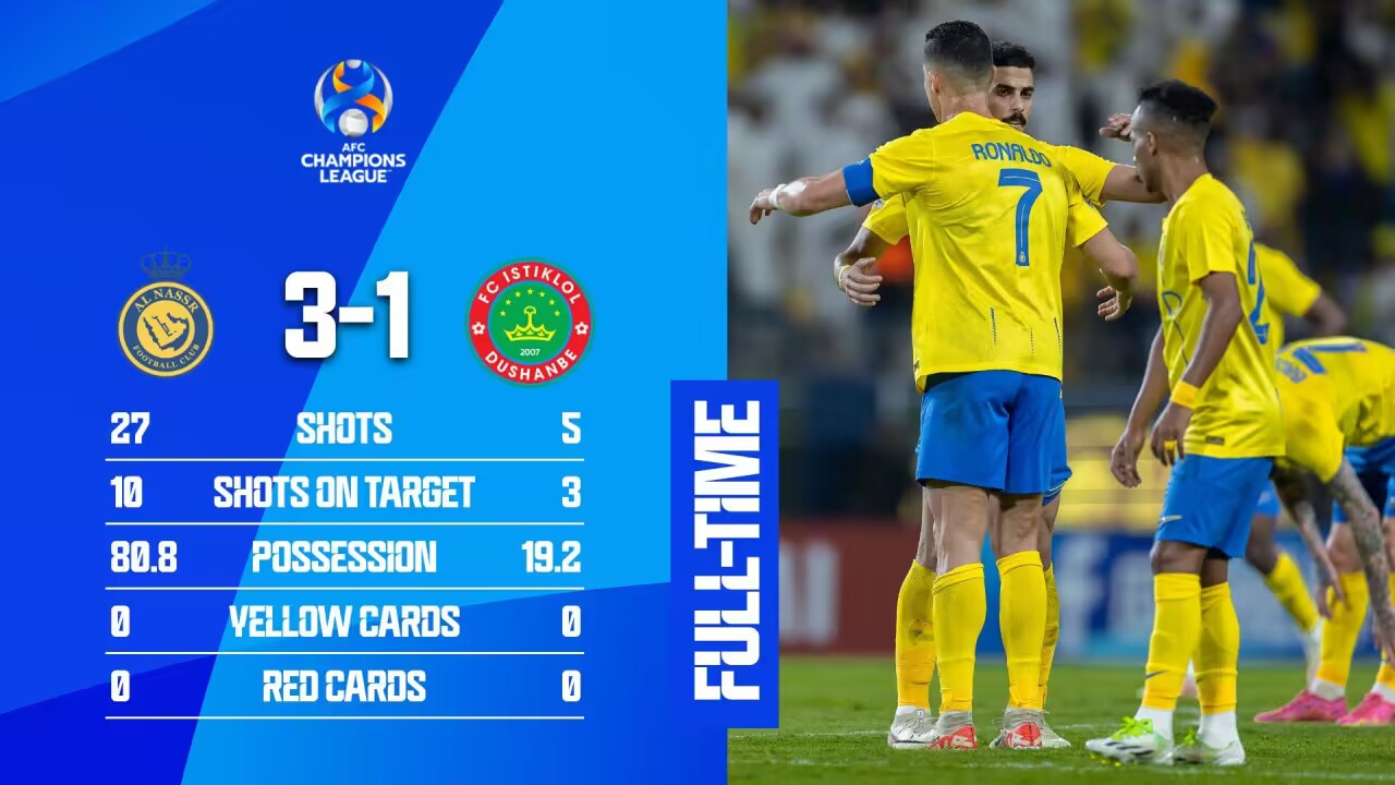 10月3日讯 北京时间10月3日凌晨2点整,2023-24赛季亚冠E组第2轮在沙特国王大学体育场展开角逐,利雅得胜利坐镇主场迎战杜尚别独立。上半场加里卜远射中柱,门将亚蒂莫夫发挥神勇,下半场C罗斩获生涯亚冠首球,塔利斯卡5分钟内梅开二度。最终利雅得胜利主场3-1逆转杜尚别独立,胜利取得各项赛事十连胜。E组积分榜方面,胜利积6分继续领跑。