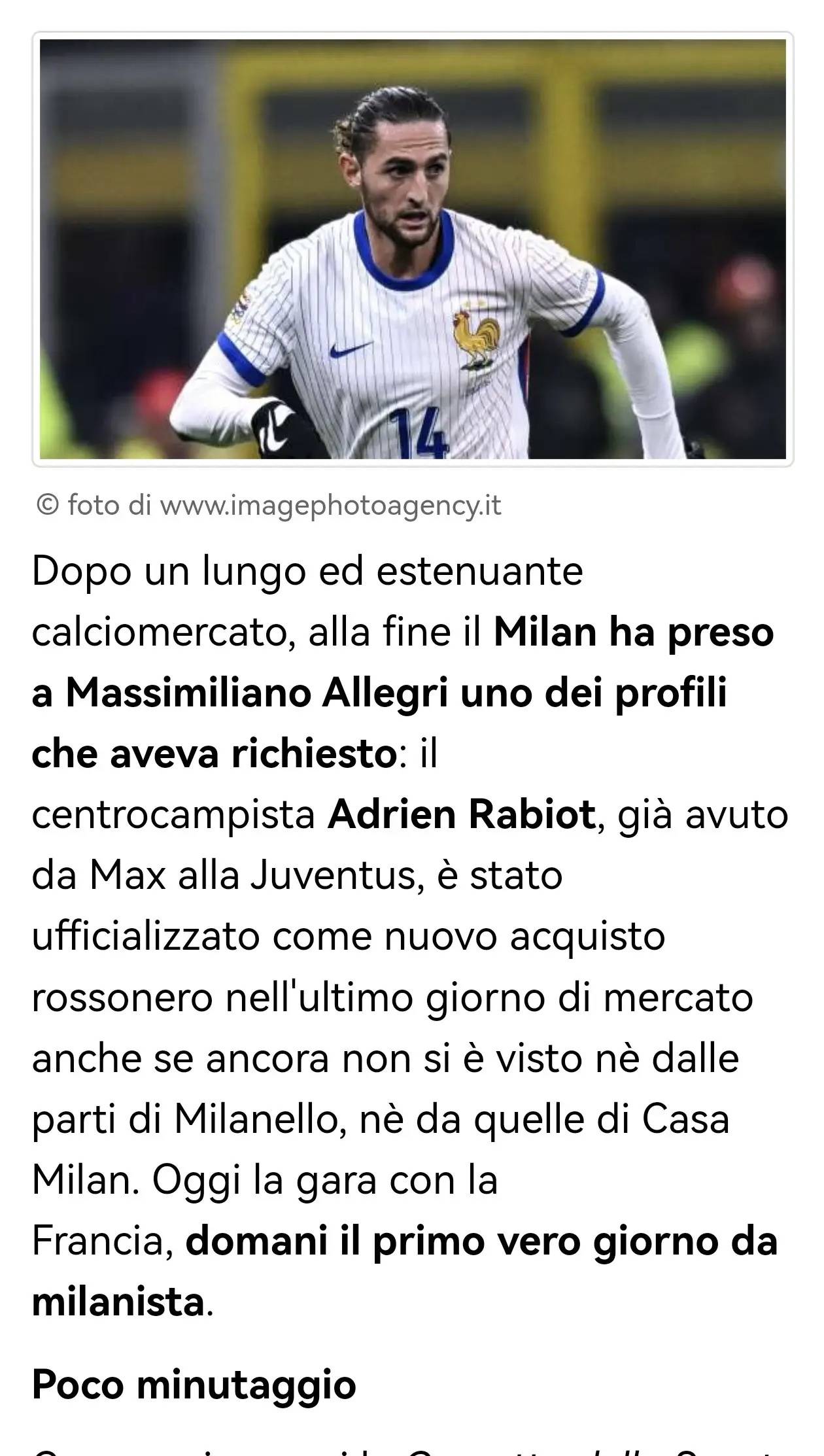 经过漫长且紧张的转会窗,米兰最终为马西米利亚诺·阿莱格里签下了他想要的球员类型之一:曾在阿莱格里麾下效力于尤文图斯的中场球员阿德里安·拉比奥特,已在转会窗最后一天正式成为红黑军团的新援——尽管目前他尚未出现在米兰内洛训练基地或米兰之家。今晚他将代表法国队参赛,明日才会迎来真正意义上的“米兰球员首日”。