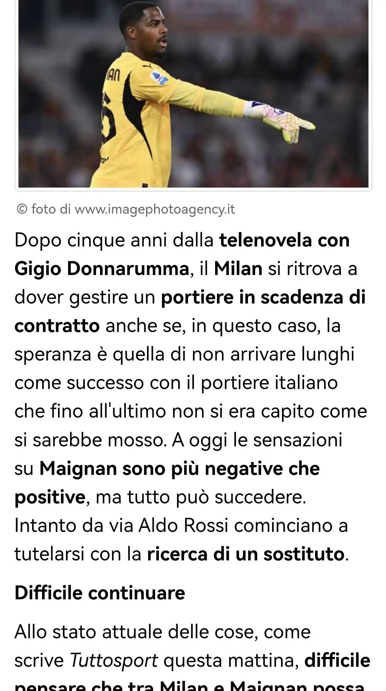目前来看,关于迈克·迈尼昂续约的前景,消极信号多于积极信号,但一切仍有变数。与此同时,米兰已开始通过寻找替代者来保障自身利益。