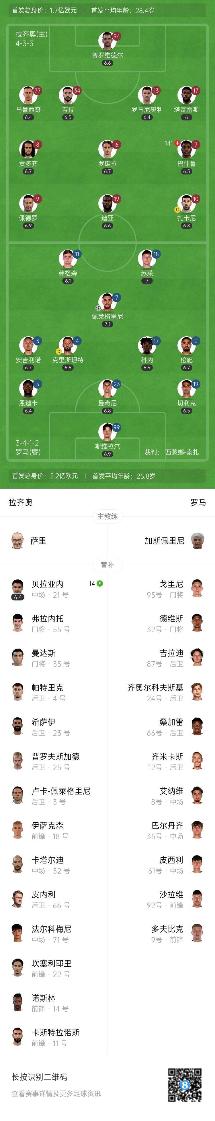 第38分钟,苏莱禁区前右侧横传做球,佩莱格里尼不停球右脚直接推射破门!罗马1-0领先拉齐奥↓