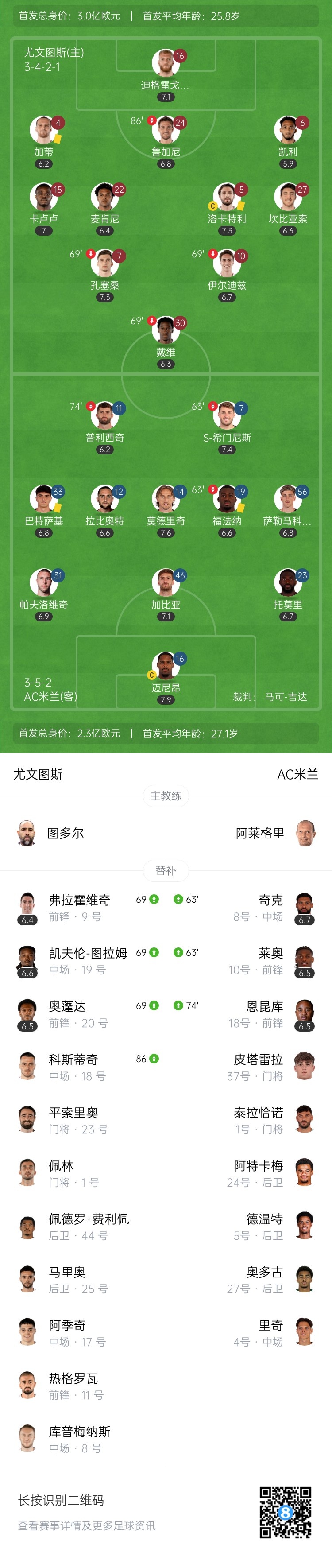 10月6日讯 北京时间10月6日凌晨2:45,2025-26赛季意甲联赛第6轮一场焦点战,尤文图斯坐镇都灵安联球场迎战AC米兰。上半场两队均无建树,暂0-0战平;下半场凯利禁区内撞倒圣地亚哥-希门尼斯送点,普利西奇罚丢,最终尤文图斯0-0AC米兰,开赛至今不败,积分来到12分;AC米兰则是结束各项赛事5连胜,积13分排名第三。