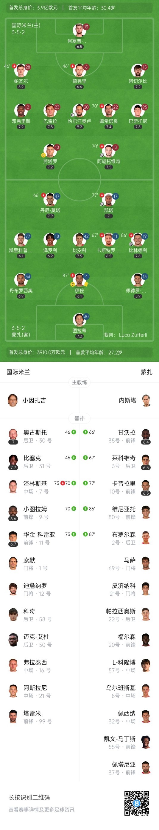 下半场补时5分钟,国米3-2蒙扎。