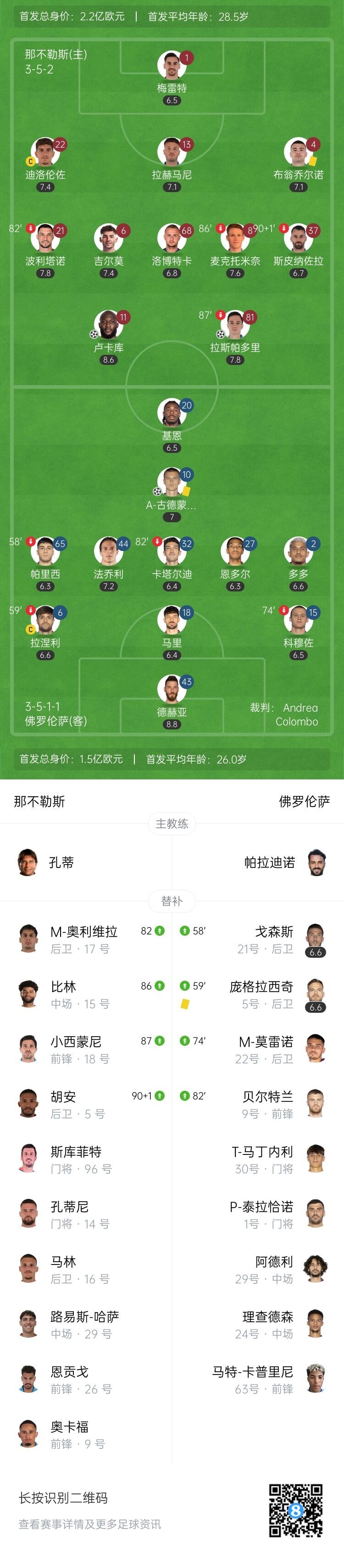 伤停补时1分钟。全场比赛结束,那不勒斯2-1佛罗伦萨。