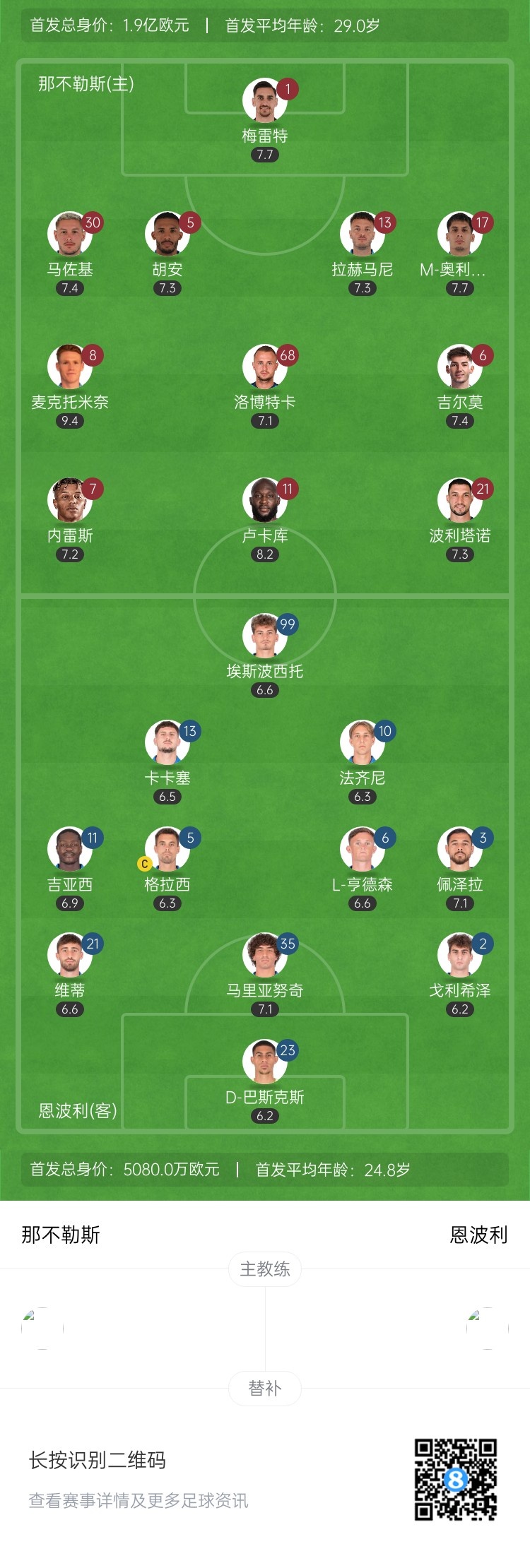 第18分钟,那不勒斯反击机会,卢卡库向前做球,麦克托米奈带球一路推进弧顶位置选择直接远射,皮球如出膛炮弹直入网窝,那不勒斯1-0领先↓