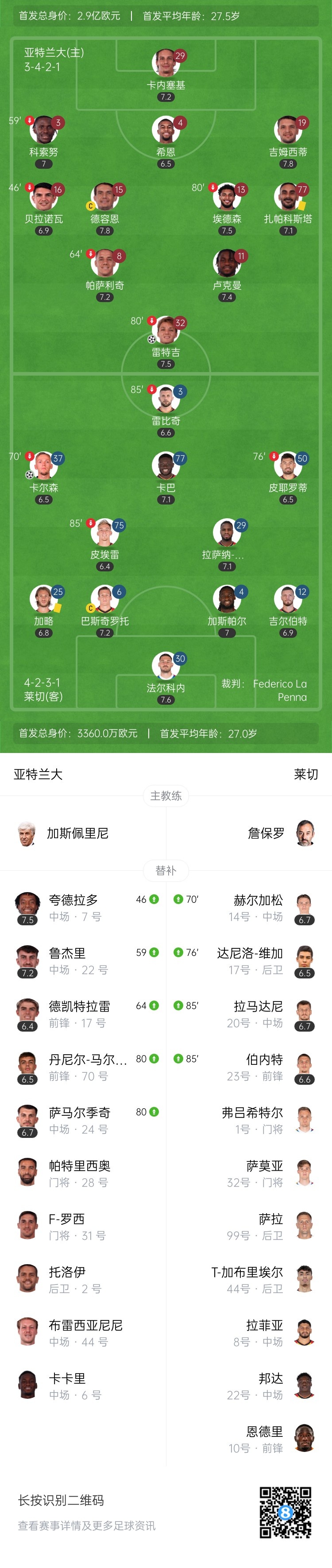 第69分钟,夸德拉多禁区内假动作突破,被绊倒!主裁判判罚点球!雷特吉主罚踢向中路,皮球擦着门将脚进了!亚特兰大1-1扳平莱切↓