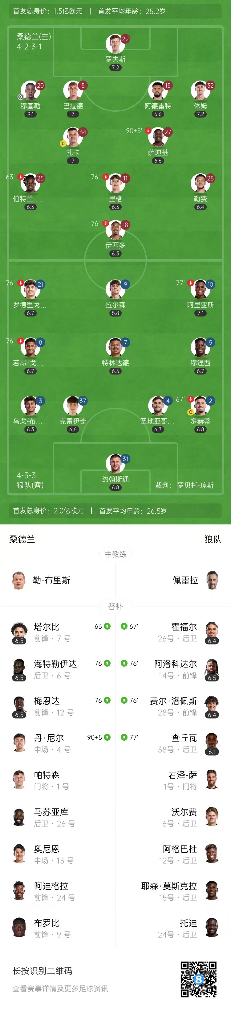 全场比赛结束,桑德兰2-0狼队。