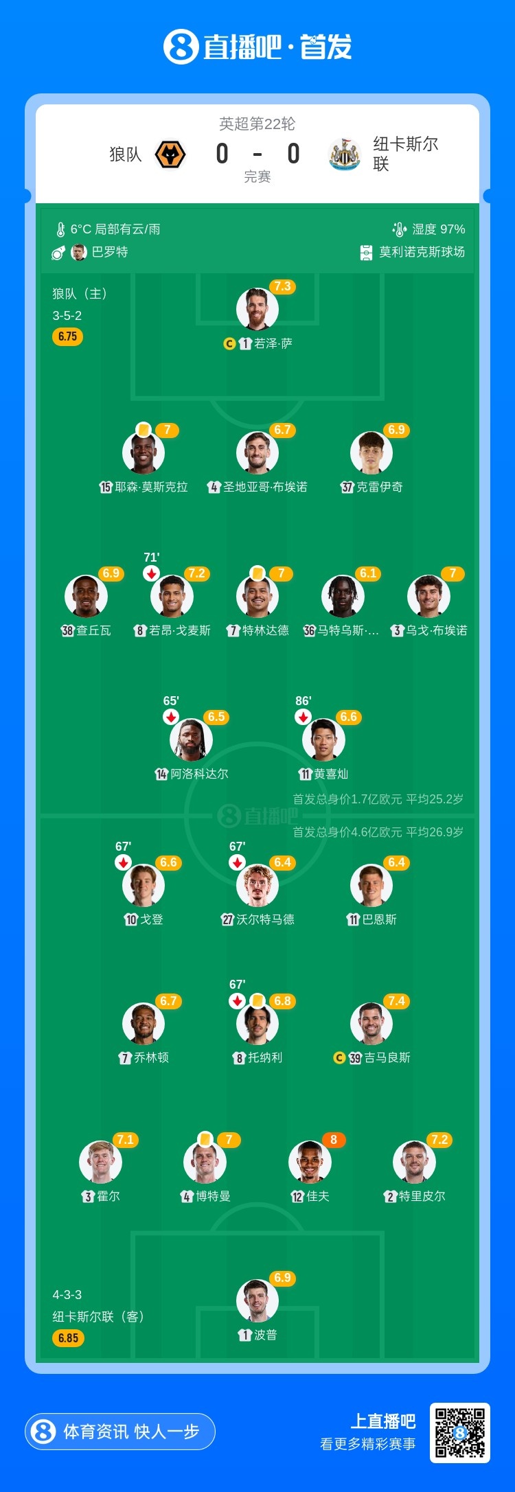1月18日讯 北京时间22:00,英超第22轮狼队vs纽卡斯尔联,比赛在莫利纽球场打响!上半场,沃尔特马德头球顶偏。下半场,特里皮尔任意球攻门造险;若泽·萨两连扑救主。最终,狼队0-0逼平纽卡,英超近4轮不败斩获6分;纽卡英超三连胜终结,各项赛事3场不胜。