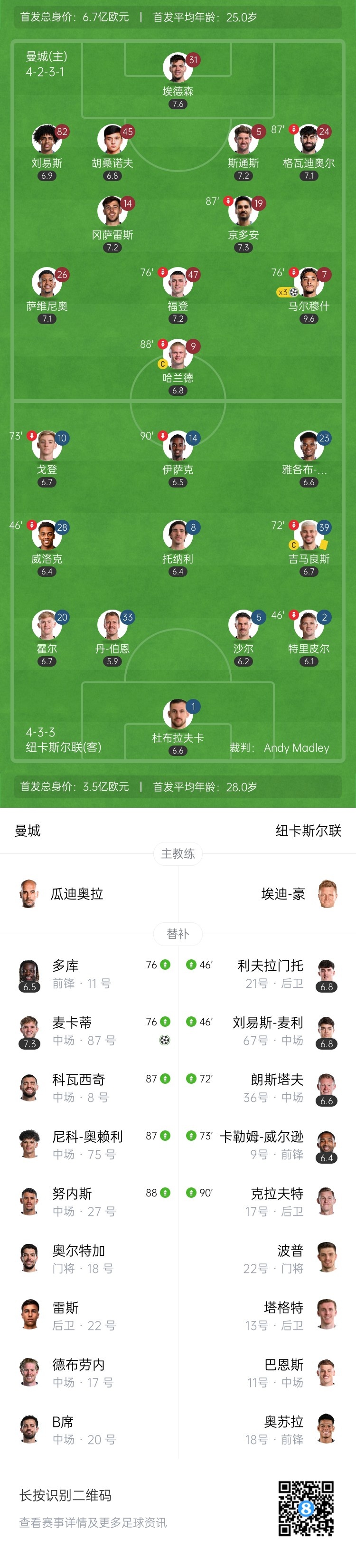 第33分钟,萨维尼奥右路得球,突破防守后禁区内倒三角传球,马尔穆什跟进推射破门,曼城3-0纽卡斯尔。↓