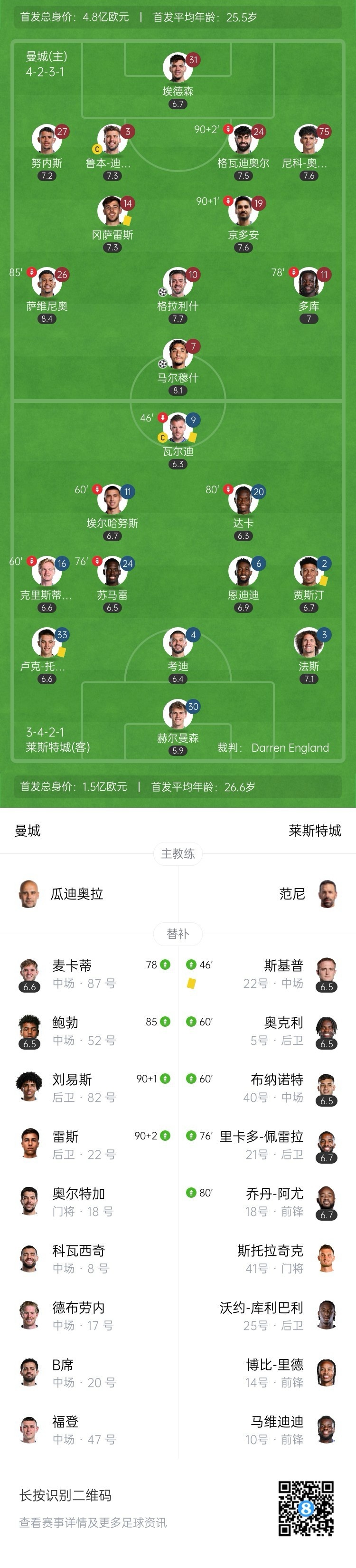 4月3日讯 北京时间4月3日凌晨2时45分,英超第30轮,曼城坐镇伊蒂哈德球场迎战莱斯特城。上半场,格拉利什闪击破门,随后马尔穆什扩大领先优势。曼城半场2-0领先莱斯特城。下半场双方均无建树。最终曼城2-0击败莱斯特城,暂升至积分榜第四位。